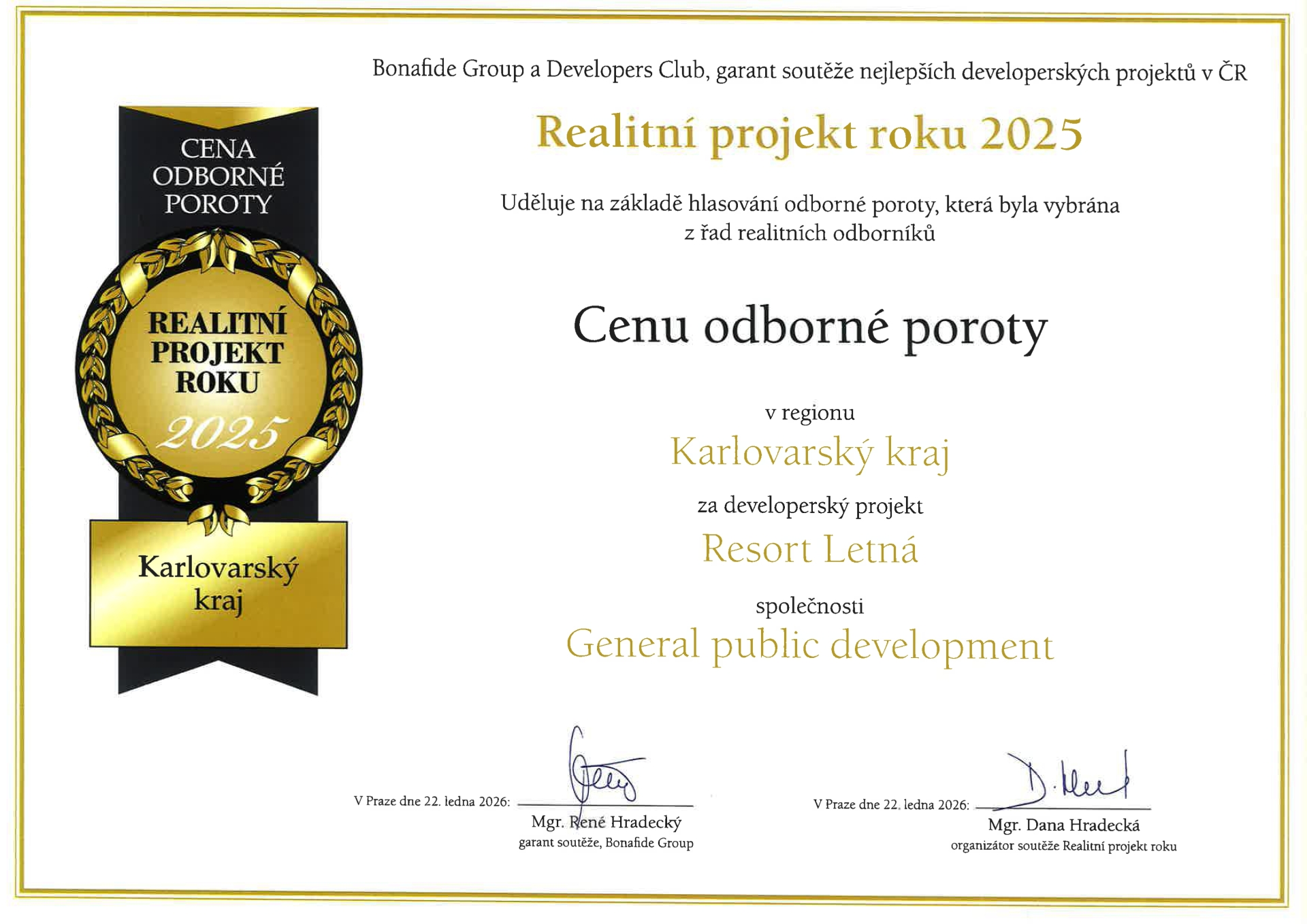 S potěšením oznamujeme, že Resort Letná získal v soutěži Realitní projekt roku 2025 Cenu odborné poroty pro Karlovarský kraj.